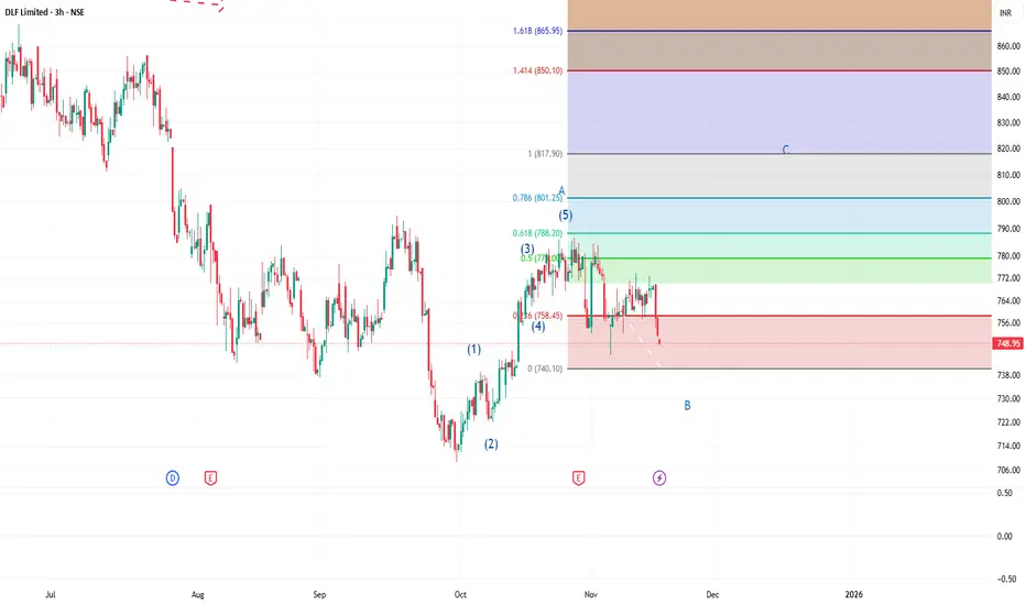 DLF appears to be undergoing a bullish correction in the form of an ABC structure. The price action from 30/09/2025 to 29/10/2025 shows a clear 5-wave impulsive move, followed by a 3-wave corrective decline, which aligns well with the characteristics of a Zigzag (5-3-5) pattern.