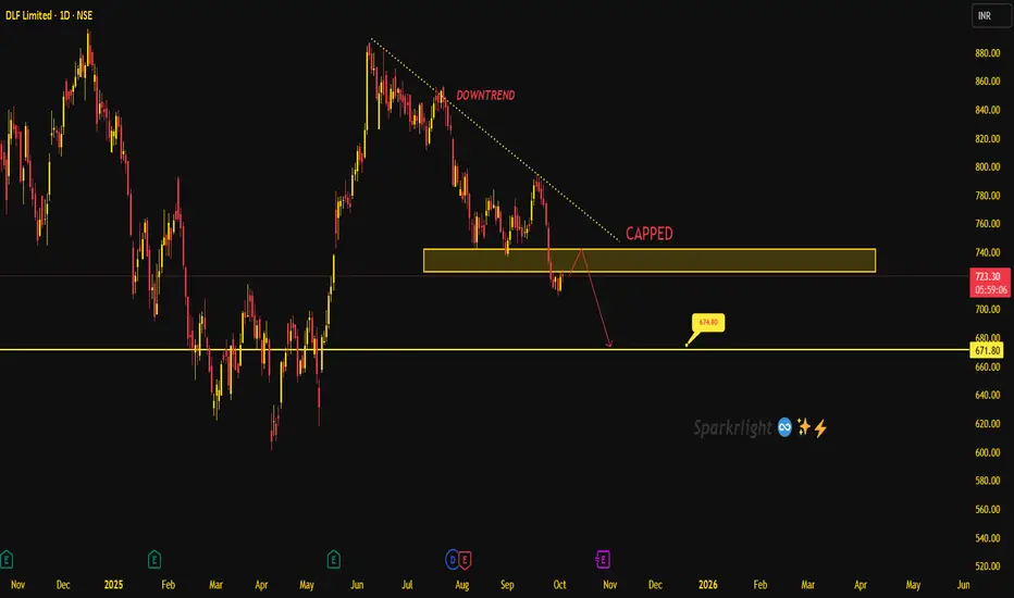 DLF is clearly locked in a downtrend, with lower highs forming under the descending trendline. Price is struggling to break above the capped supply zone near 735–740, which continues to act as strong resistance. As long as the stock remains below this zone, the pressure stays on the downside with the next major support seen around 675–672. A break toward this level looks likely in the coming sessions, unless bulls manage to reclaim and sustain above the capped zone, which would temporarily ease the selling pressure. Until then, the structure remains bearish, with sellers holding control. Trade safe !