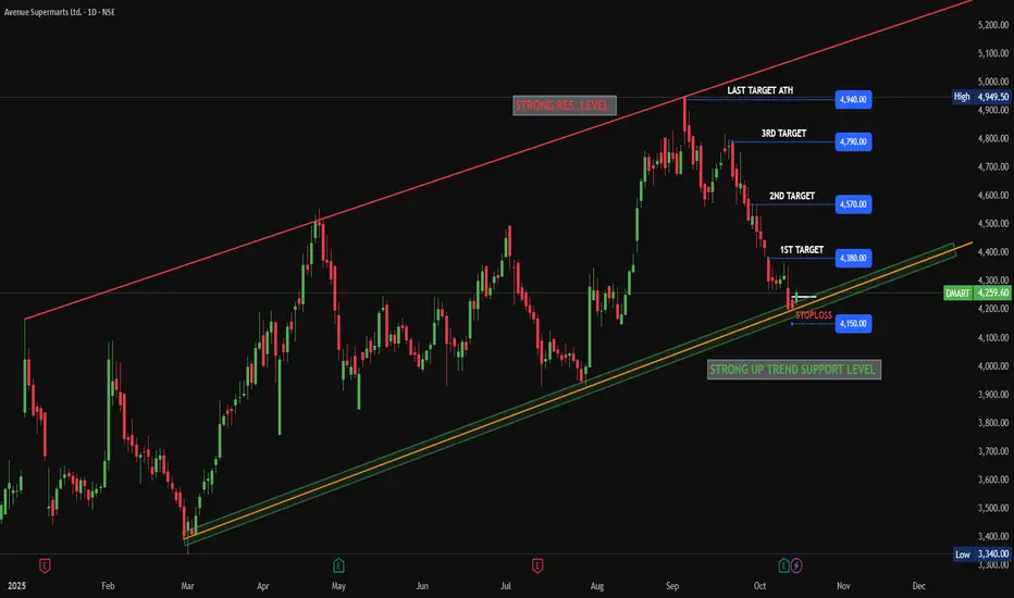 DMART (Avenue Supermarts) has reached a strong trend support level. Additionally, in the daily timeframe, the current candle closed at the previous day's candle level.