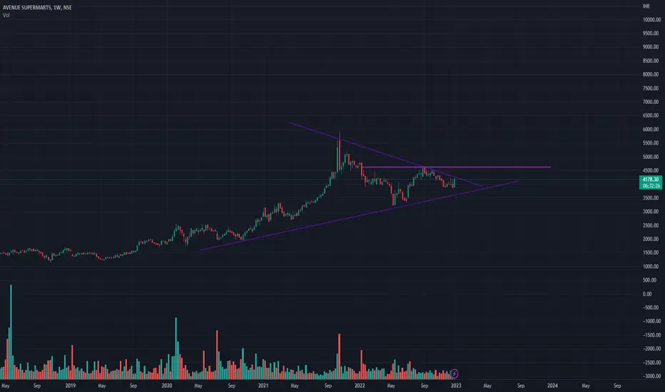 Dmart is in a range bound from 2/3 months and it has come to resistance if it will break it will boom .and it is forming triangle pattern