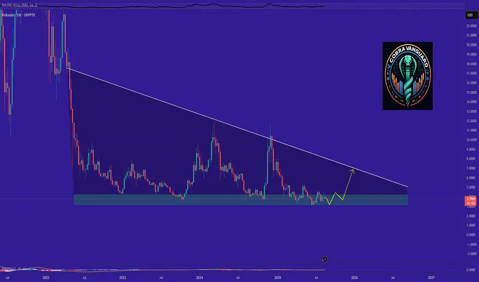 The price is trapped inside a triangle, and it is currently at the triangle's bottom. If we look at previous lows, the price has typically seen strong growth after hitting the bottom. If the price follows previous trends, we should now expect a price increase.