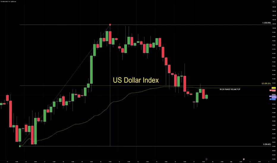 Dollar is trading in the discount of the daily bullish range, losing momentum, and flipping the range volume node bearish at 99.291.