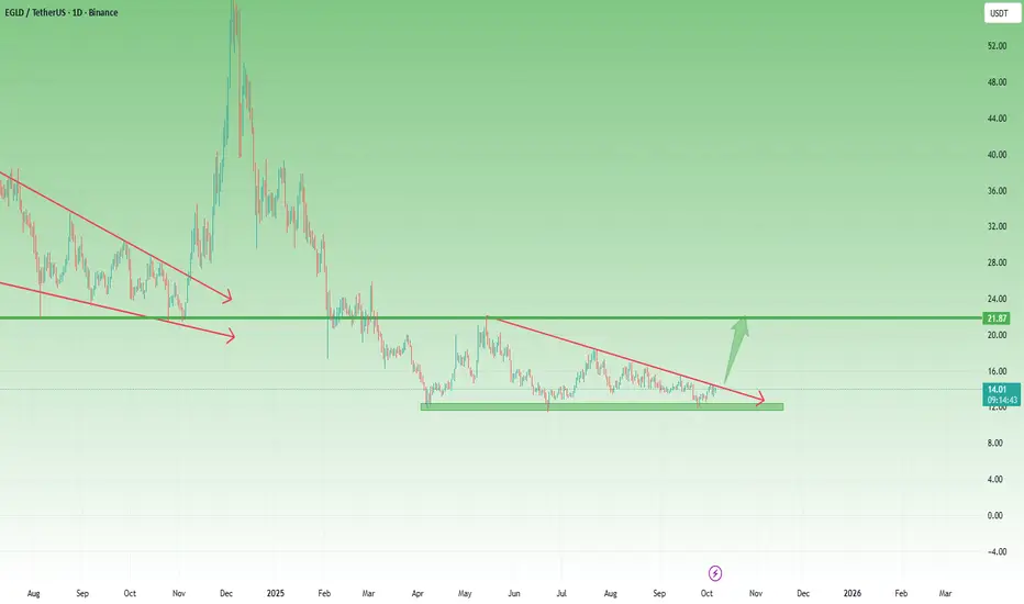 By the end of September, price revisited the $12 area for the third time, and once again buyers stepped in decisively, triggering a solid rebound. Now, EGLD trades around $14, sitting just below a falling trendline that has capped upside momentum for months.
