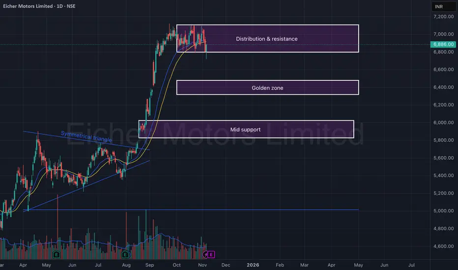 Following an extended rally from the breakout of the symmetrical triangle, the stock appears to be entering a cool-off phase — likely testing lower supports such as the golden zone (₹6,300–₹6,450) or mid support (₹5,900–₹6,000) before resuming its larger trend.