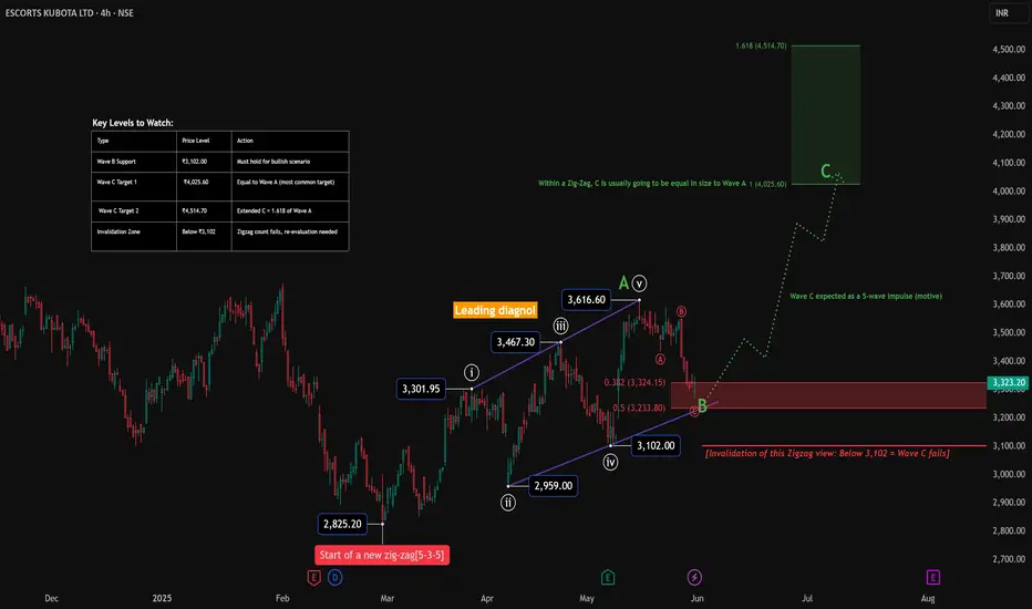 ESCORTS may be unfolding a classic Zigzag correction (5–3–5) from the low at ₹2,825.20. Wave A formed a clean leading diagonal. Wave B is currently developing and is expected to end near the 0.382–0.5 retracement of Wave A.