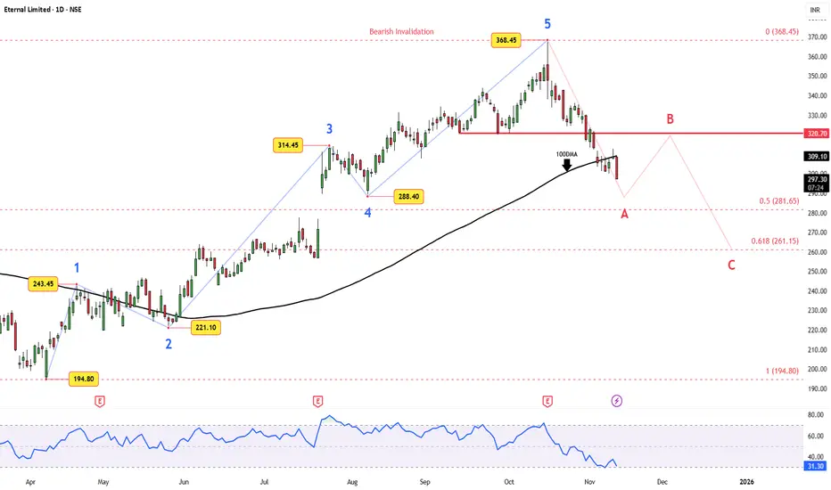 Eternal (Zomato) appears to have completed a clean 5-wave impulse from ₹194 → ₹368.45 and is now shifting into a corrective phase.