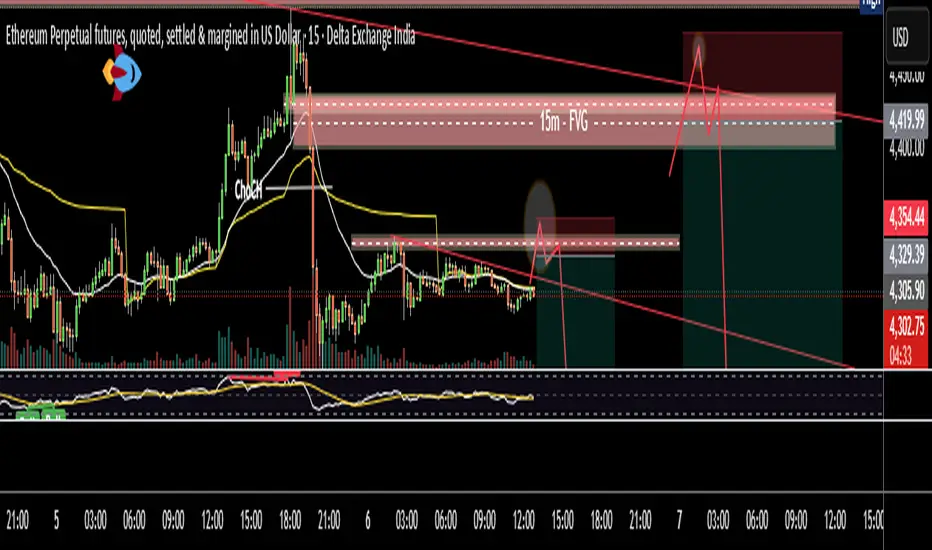 ETH is moving in range for almost a week time. Now it has shown a displacement after ChoCH and formed a bearish 15m FVG. There may be a good trade at sell side if price approach it. Well there are two trade scenarios are forming.