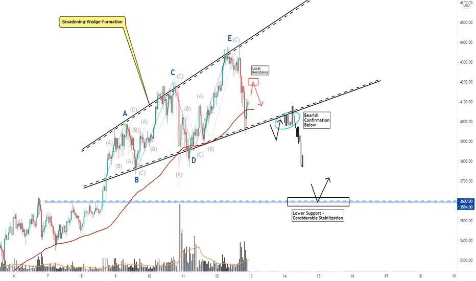 Welcome to this analysis about Ethereum, we are looking at the 45-minute timeframe perspectives. In recent times Ethereum showed up with this initial bearish move to the downside after marking its top at the 4350 level, it is a move that should not be underestimated out of a bearish perspective. Besides that Ethereum established this main broadening-wedge-formation with the coherent wave-count within already completed. Now when Ethereum moves on to pull back from the local resistance and does not possibly manage to stabilize above it this will complete the broadening-wedge bearishly to the downside when Ethereum closes below the lower boundary as it is shown in my chart, when this happens it will likely go further to test lower supports.