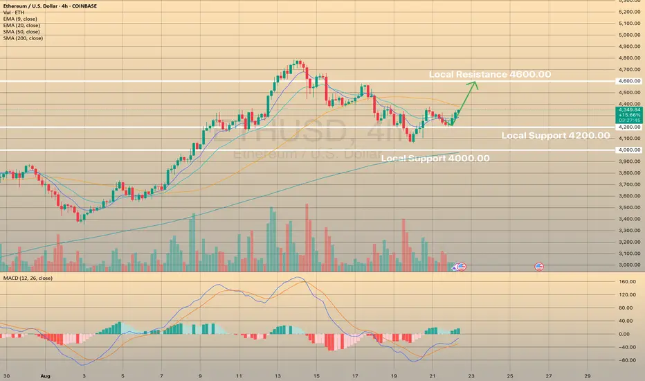 Recently the asset managed to hold above the 4,200.00 level. Right now, ethereum is developing a new bullish momentum heading towards 4,600.00 local resistance. MACD has crossed and is in the green zone currently on 4-hour timeframe.