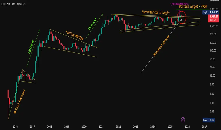 Symmetrical Triangle Breakout: ETH successfully broke out and retested the upper trendline (see red circle). This retest confirms the breakout validity.