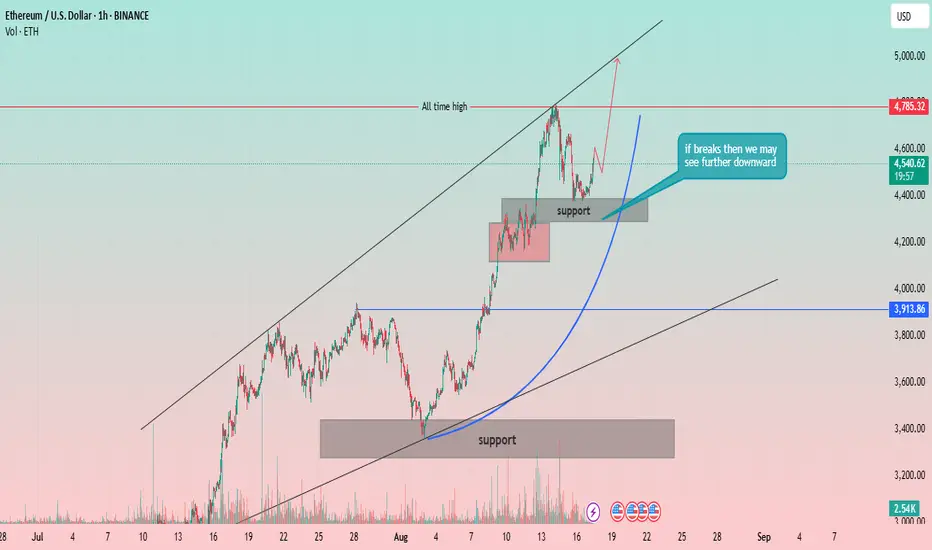 A key annotation states, "if breaks then we may see further downward." This highlights the importance of the 4,200 USD support zone. A break below this level could indicate a potential deeper retracement, possibly towards the lower trendline of the channel or the major support zone.