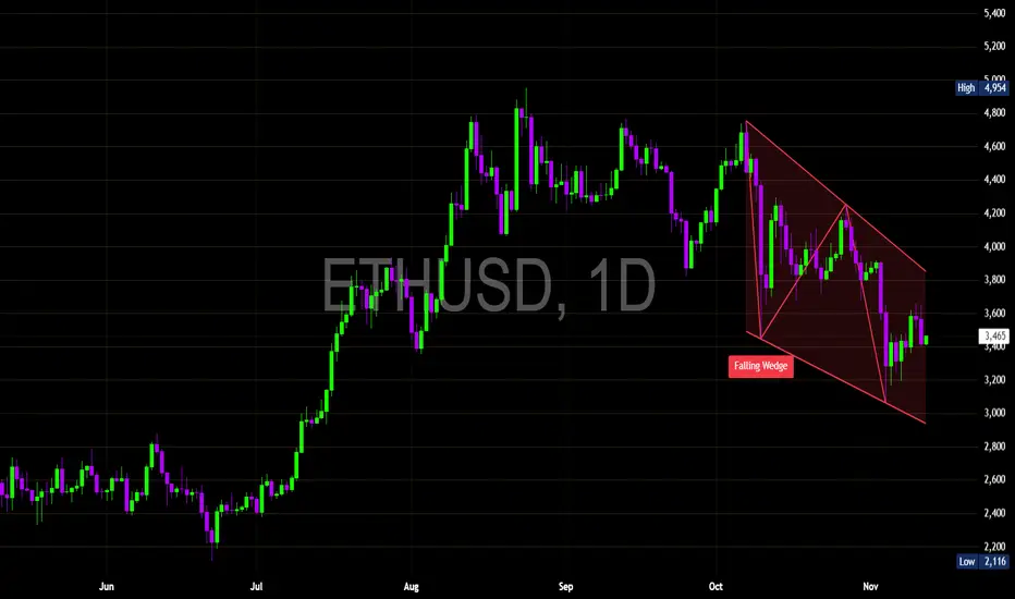 #Ethereum has been consolidating within a Falling Wedge pattern since early October — a structure that often precedes a bullish reversal when confirmed with volume.