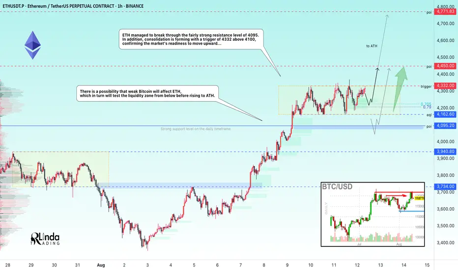 ETH is quite strong and the market may not allow the price to fall too low, as there is a lot of excitement. However, I do not rule out the possibility that weak Bitcoin will affect ETH, which in turn will test the liquidity zone (4162 - 4095) from below before rising to ATH.