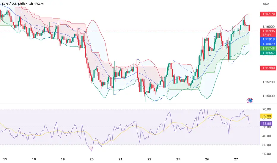 EUR/USD is trading in a short-term bullish structure after bouncing from the mid-Bollinger band and holding above the intraday support zone at 1.1575–1.1565. Buyers pushed price toward the upper band, but the pair is now facing strong resistance at 1.1615–1.1620, where recent candles show rejection. RSI is slowing down from the 60+ region, indicating reduced momentum. If price stays above 1.1575, a continuation toward 1.1615 remains possible, offering a 1:1 reward setup. However, a break below 1.1575 may pull the pair back toward the next support at 1.1539, signalling weakening bullish pressure.