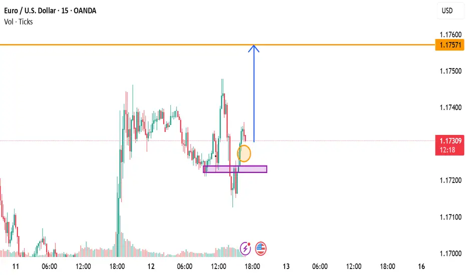 Price has successfully retested a key support zone (marked in purple) and is showing strong bullish momentum on the 15-minute chart. This retest confirms buyers are stepping back in.