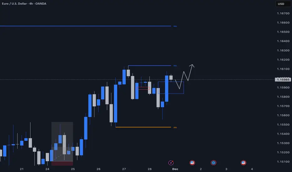 Strong bullish continuation. Buy-side liquidity raided below range; smart money positioned long for markup into premium arrays. Increasing upside volume and reduced sell pressure above