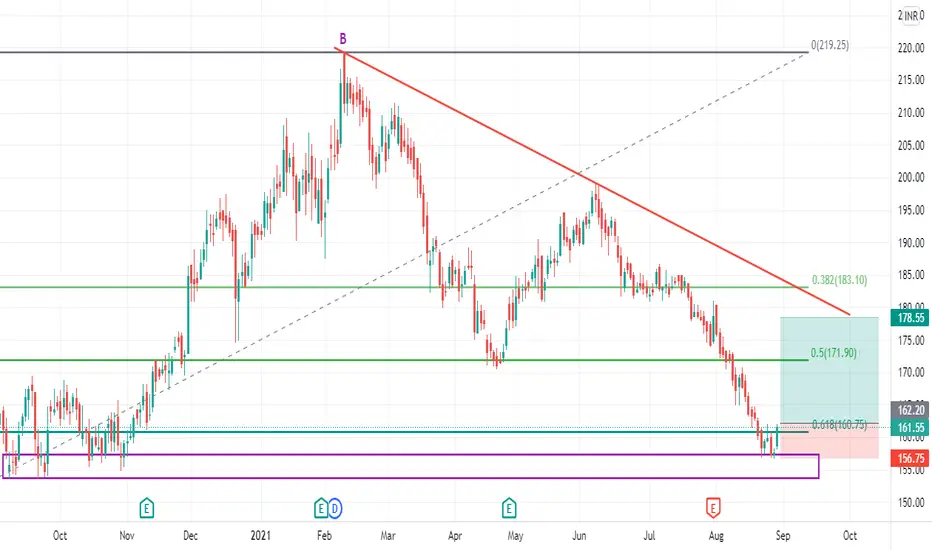 1. On a daily timeframe if we draw the Fibonacci retracement tool from recent swing low (point A) to recent swing high (point B) then we see stock took support from 0.618 Fibonacci level.