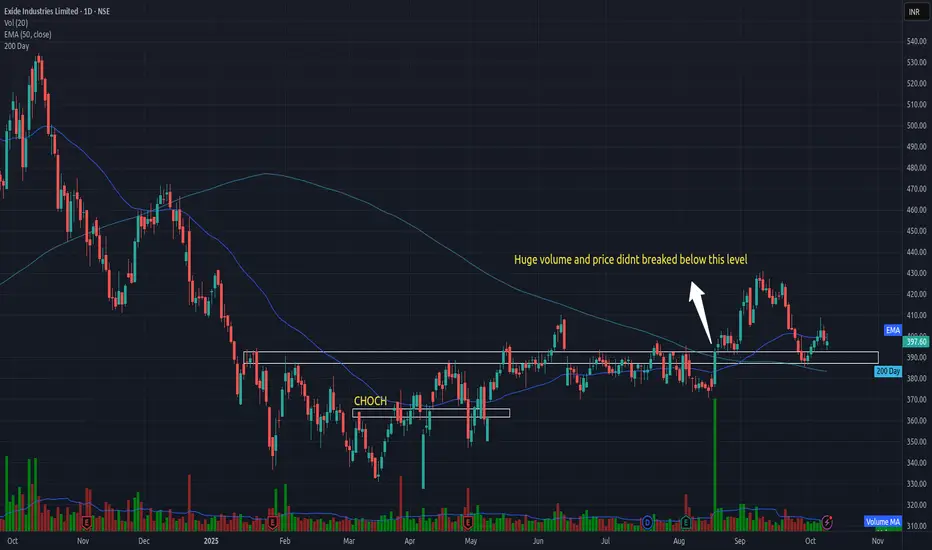 The ₹380 level acted as a strong resistance zone from February to August 2025. The price has now pulled back to this level, and it appears to be acting as strong support. This is a classic "resistance-turned-support" pattern, which is often a reliable indicator of strength.