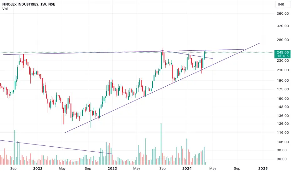 In this script FINPIPE, there is a ascending triangle pattern in W-TF which is going to give a breakout. this stock also performed well in the past. the MACD indicator shows the buying signal in W-TF. it also gave a breakout from a symmetrical triangle pattern in D-TF. Thus, it shows the positive short-term trend.
