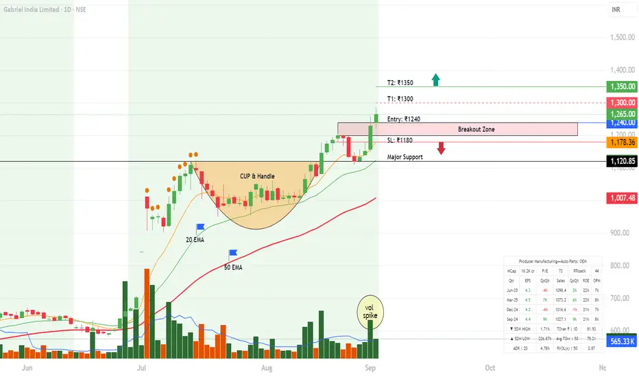 Gabriel India has formed a classic Cup & Handle pattern on the daily timeframe and given a decisive breakout above ₹1200 with strong volumes.