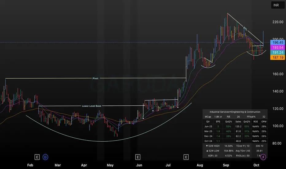 This TradingView chart displays a classic cup and handle pattern marked by a rounded lower-level base and a pivot breakout zone. Price consolidates under a descending trendline (DTL), which it recently broke, signaling a potential bullish trend continuation. Moving averages support the ascending momentum after the breakout, while quarterly earnings and financial data reinforce fundamental strength. This setup serves as a prime example of blending technical patterns with fundamental insights for strategic trade entries.