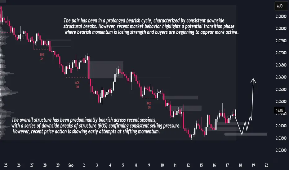 GBPAUD has been moving through an extended bearish cycle, confirmed by multiple downside breaks of structure that signaled strong sell-side control. Each leg cleared liquidity and left inefficiencies behind, reflecting a market environment dominated by distribution phases. Recently, however, the dynamics are shifting. Price action has begun to compress, with shorter bearish candles and emerging higher lows that point toward weakening seller momentum and the early signs of accumulation.