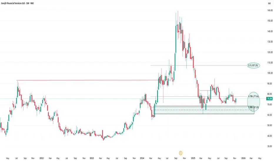 Price is consolidating inside a strong demand zone around ₹67–70. A bounce from this zone can offer a clean swing setup.