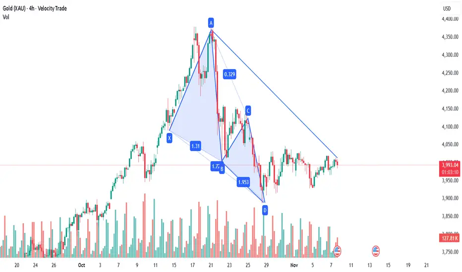 On this chart, Gold has formed a clear X-A-B-C-D harmonic structure, with the final leg (D) completing near a strong support zone around 3,850–3,870.