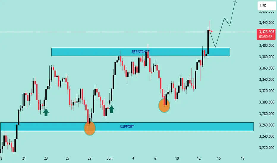 The chart illustrates a bullish breakout above a well-defined resistance zone around $3,390–$3,400. Price action has decisively closed above this resistance, suggesting strong bullish momentum.
