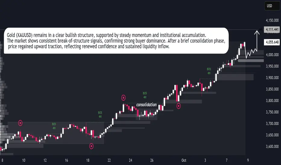Gold (XAUUSD) continues to follow a strong bullish trajectory, confirming consistent market confidence and institutional participation. The chart structure reveals clear liquidity shifts and a steady series of bullish break-of-structure (BOS) points, suggesting that buyers remain in firm control. After a brief consolidation phase, gold resumed upward momentum, supported by sustained volume and steady market sentiment.