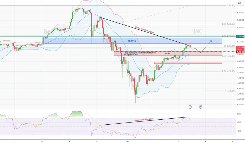 - After which prices might continue the bullish trend towards the blue zone (1H iFVG between 5100-5170).