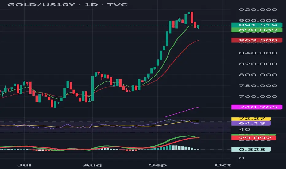 Gold vs. US 10Y yield ratio surged to extreme highs but is now showing weakening momentum. RSI has pulled back from overbought and MACD is cooling.