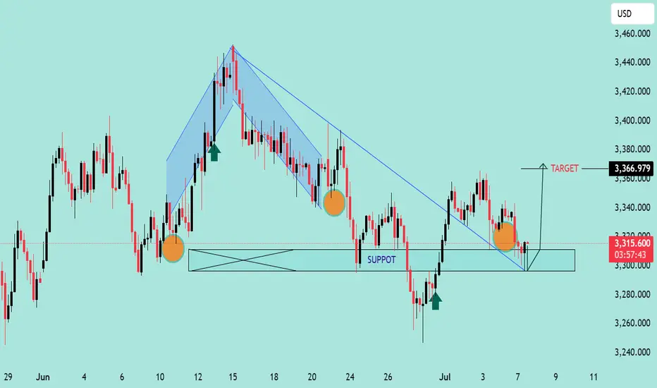 Support Zone: Price is consistently respecting the horizontal support range near 3,305 – 3,310, confirming it as a strong demand zone (marked by multiple orange circles and previous bounce reactions).