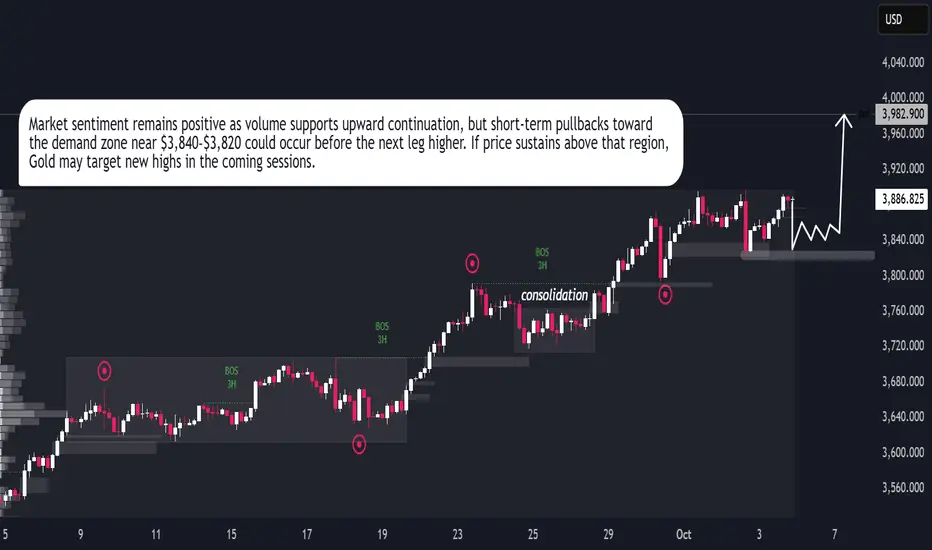 Gold remains in a strong bullish structure, showing consistent higher highs and steady momentum after each correction. The market has been consolidating above the $3,800 zone, where buyers continue to absorb liquidity and prevent deeper declines. This zone acts as a solid base for potential upward expansion. Current market behavior indicates controlled accumulation, suggesting that institutional buyers are maintaining dominance. If gold holds above $3,840–$3,820, the next bullish leg may target the $3,960–$4,000 region. A short-term retracement could occur, but overall momentum favors continuation. The price structure and volume behavior both support further upside, reflecting strong buyer control and stable sentiment in the market.