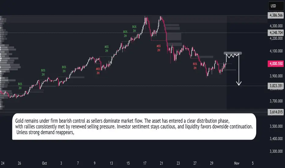 The broader outlook remains subdued, with market conditions favoring continued downside until clearer evidence of renewed demand emerges. Gold’s performance reflects a phase of market adjustment, where declining liquidity and moderate volatility reinforce the persistence of bearish sentiment across the short-term horizon.