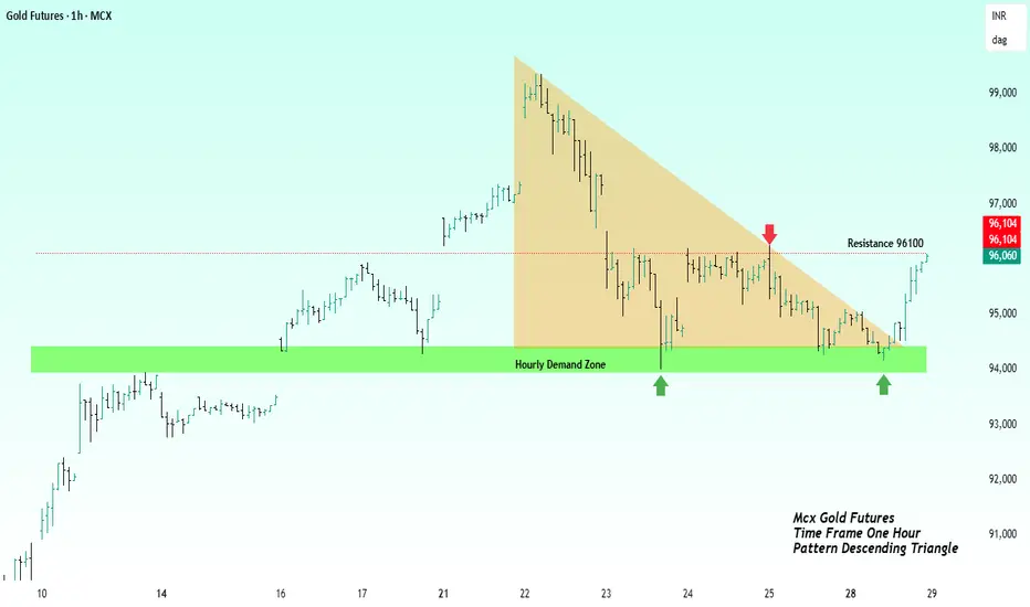 Gold Futures (MCX) is currently forming a bullish setup with multiple rejections from a strong hourly demand zone and compression below the 96100 resistance level. A confirmed breakout above 96100 on the 1-hour timeframe will indicate renewed buying interest and a potential trend continuation.