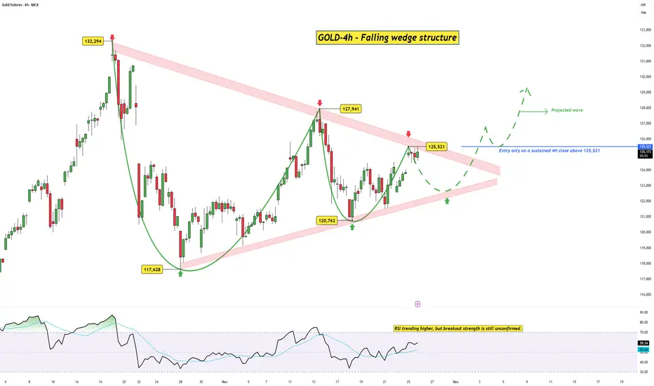 Gold is displaying a well-defined falling wedge with clear signs of seller exhaustion and buyer strength. The structure leans bullish, but the move needs to be validated through a confirmed break above 125,521. Until then, the wedge remains a compression zone — not a breakout.