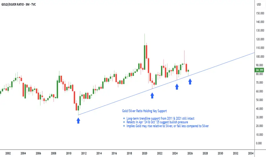 This repeated bounce suggests the ratio is respecting this long-term support, which could imply a bullish bias in Gold vs Silver.