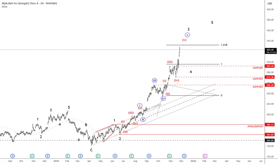 Google is in a very strong uptrend as expected, but we can now count five waves up within the black wave three cycle from around 160. Ideally, the next pullback would be wave four, stabilizing near the previous fourth-wave area around 292–271. And once or if we see that kind of correction, that's when new buying opportunities could appear, but for now, it’s better to stay cautious since we may already be in the later stages of this cycle.