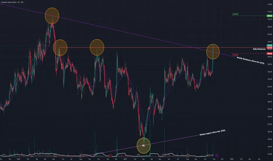 After being in a multi-year downtrend since its All-Time High (ATH) in August 2018, Graphite India (GRAPHITE) is showing compelling signs of a major trend reversal. Today's powerful price action has broken through two critical resistance levels, suggesting a new uptrend may be underway.