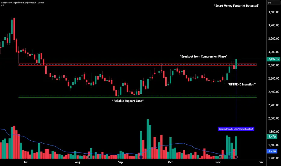 After multiple accumulation attempts between 2,500–2,650, GRSE broke out with a clean, strong bullish marubozu candle.