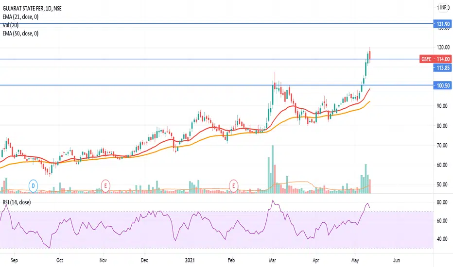 The stock closed right above the support line. GSFC served a nice 20% profit in the past 5 trading sessions. We are expecting stock can give a return in the next few trading sessions. We are expecting the stock to go up to 131.90 in few days. Stock may consolidate near the support line for 2-3 trading sessions.