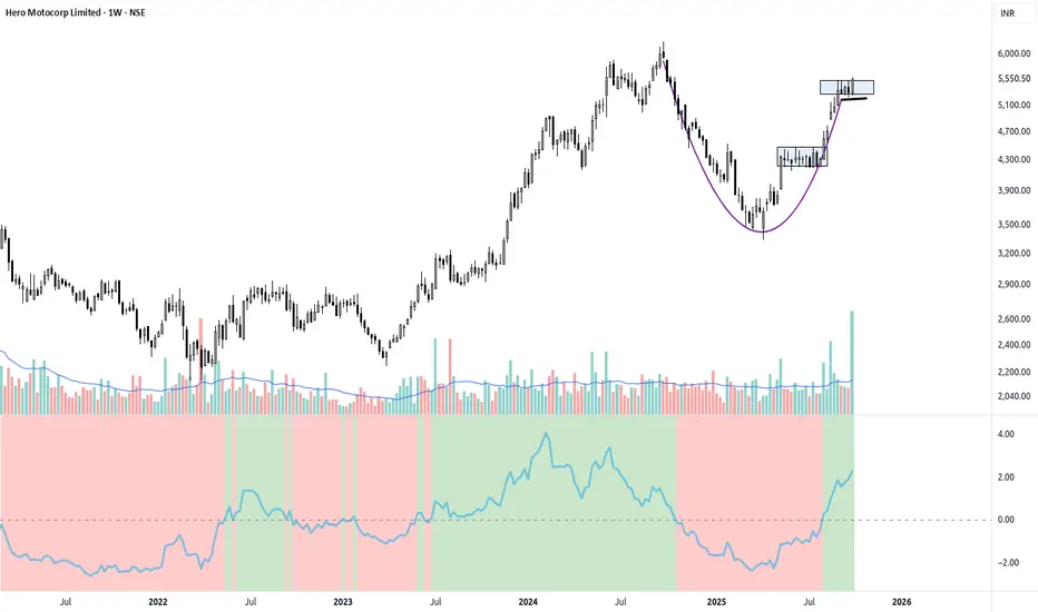 HEROMOTOCO has had a strong multi-month rally, emerging from a large, rounded base (the "Cup"). It is now forming a very tight bullish flag or continuation pattern right below its major "Weak High" at ₹6,000. This is a classic, high-probability formation: