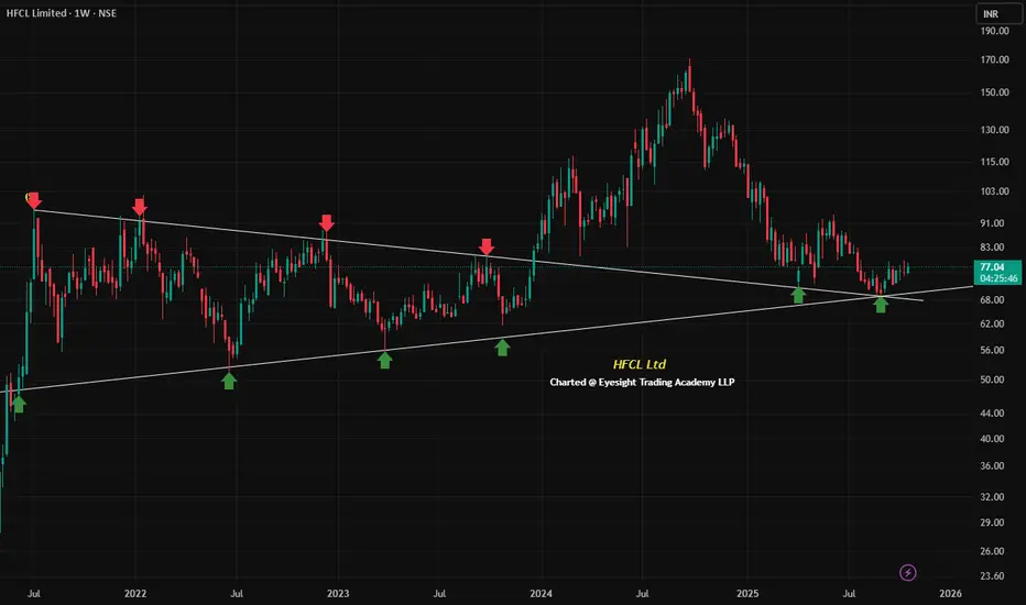 HFCL Ltd. is currently trading around ₹77.12 and presenting an interesting technical setup for chart watchers and swing traders. On the weekly timeframe, the stock is attempting to respect two key support zones simultaneously: