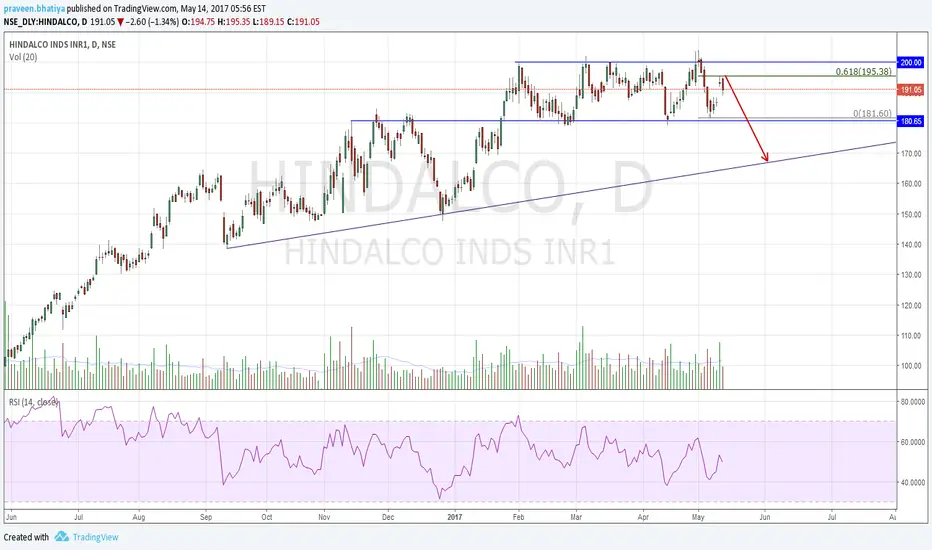 The prices are moving in a parallel channel since 01.02.17. Second last bar seems to be an pseudo Upthrust bar with good volume as last bar was a bearish engulfing and that too at significant 61.8 Fib level. One can short the stock taking the high of this bar as stop loss(closing basis) and look for the lower boundary of channel as first target which is quite reasonable risk to reward. However trader with patience can wait for the move till 170.