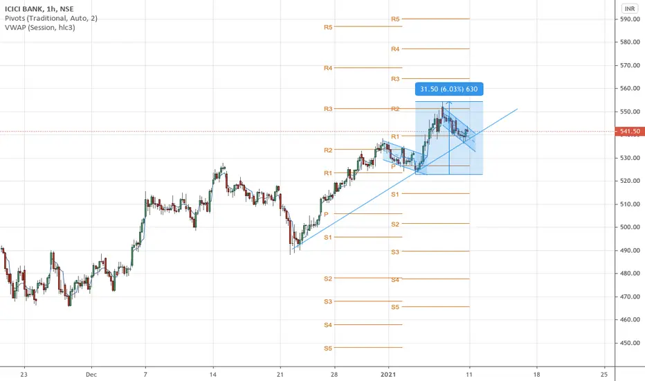 ICICI Bank is forming a flag & pole pattern. Can expect a minimum 30 points move if it breaks on the upside. It has also taken good support from the upwards trend line.