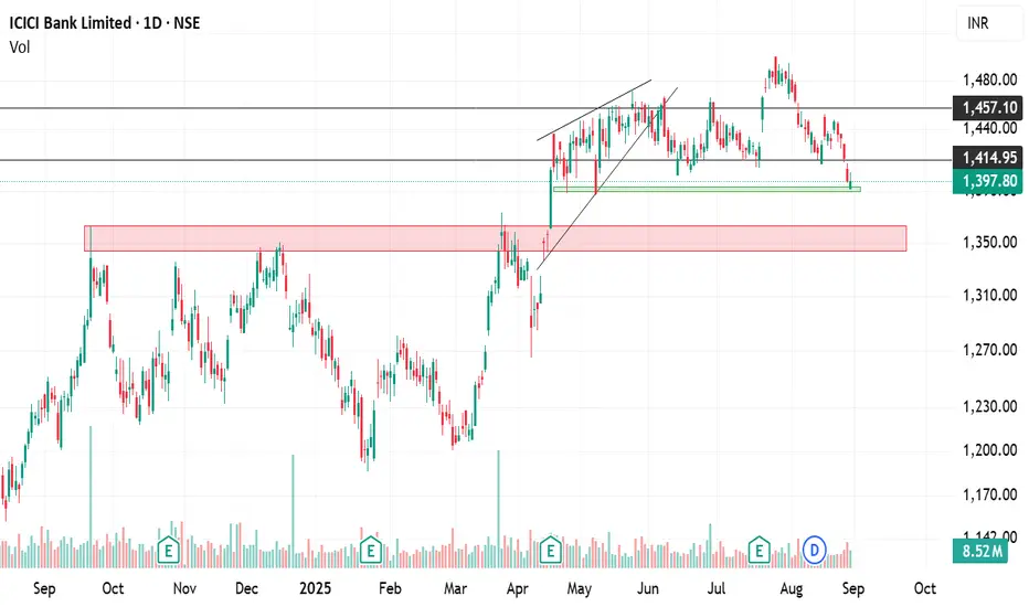 Currently, ICICI Bank is trading around a crucial support band of ₹1,400–1,390. This zone has historically acted as a strong base, where buying interest has emerged in the past. However, repeated testing of this support without a meaningful bounce raises concerns about its sustainability.