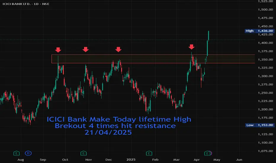 NSE INDIA , SYMBOL : ICICI Bank TIMEFRAME : DAILY : ICICI Bank first time lifetime high make 1365 on dated 20/09/2024 then 4 times try to breakout this lifetime high but failure touch this level and return down 4 times. 17/04/2025 breakout this level and today ICICI Bank make new High 1435