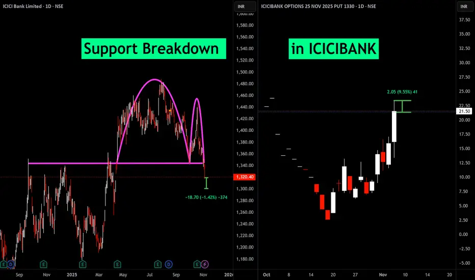 The chart shows ICICI Bank's daily price slipping below strong support, which traders watch carefully to time short or protective put option trades.