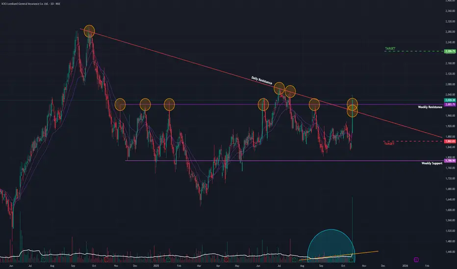 ICICI Lombard General Insurance has delivered a powerful bullish signal today, breaking out of a year-long consolidation phase by shattering two distinct resistance levels on massive volume. This decisive action suggests the sideways trend has ended and a new uptrend is likely beginning.